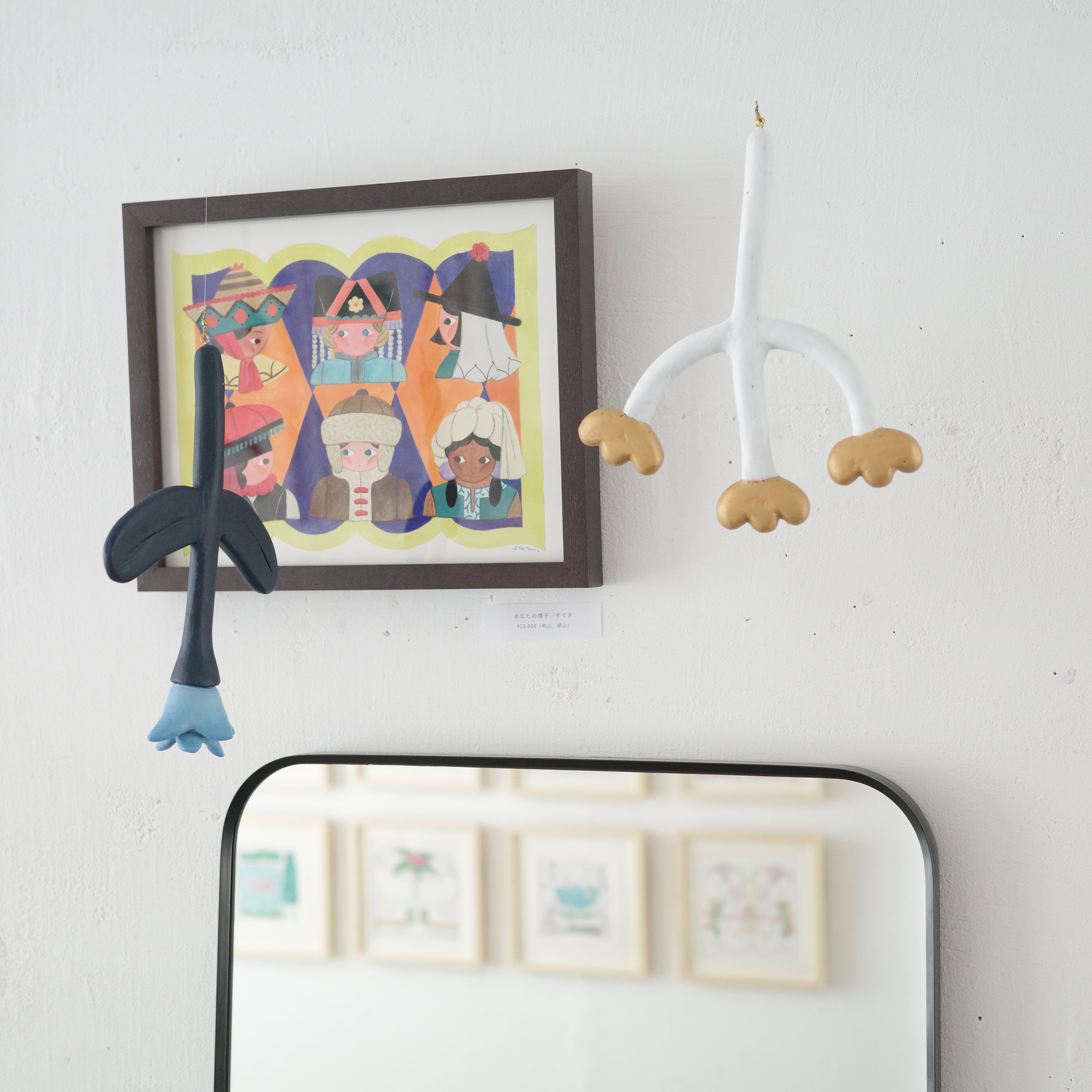 カレンダーの原画をメインに、線画のドローイングや立体作品も展示販売中。