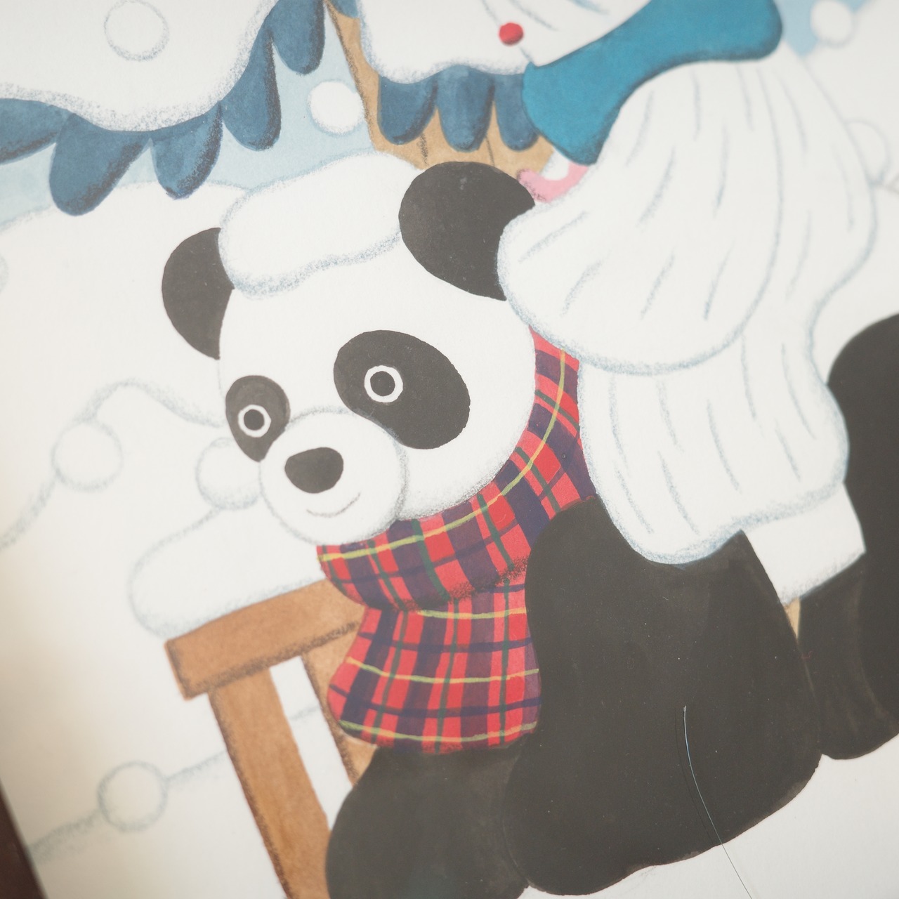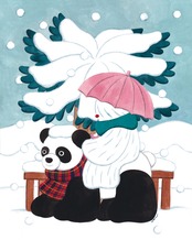 イエティとパンダ、雪がしんしんと降る真冬の景色。
